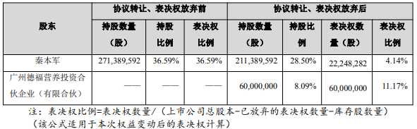 2025年12月22日,公司控股股东、实际控制人秦本军与广州德福营养签署了《控制权变更框架协议》《股份转让协议》《表决权放弃协议》,约定秦本军向广州德福营养协议转让其所持上市公司6,000万股股份(占公司总股本比例为8.09%),放弃189,141,310股股份表决权(占公司总股本比例为25.50%),保留22,248,282股股份表决权(占公司总股本比例为3.00%)。